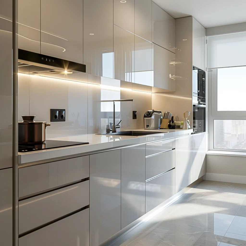 Upotreba visokokvalitetnih materijala poput nerđajućeg čelika, stakla i visokosjajnih površina često je karakteristična za modernu kuhinju, dok su skriveni aparati i pametna rešenja za skladištenje takođe česti elementi.